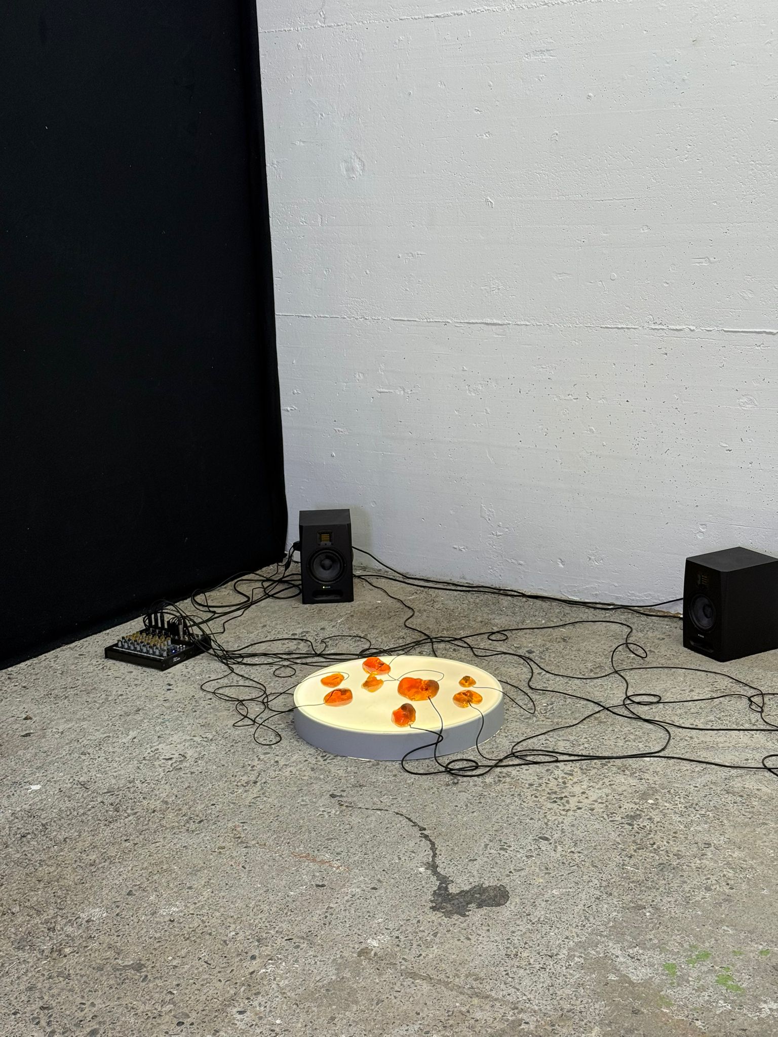 The installation consists of eight rosin sculptures ("witch stones"), each containing a contact microphone. The sculptures are placed on a luminous base and connected to a sound amplification and diffusion system. During the exhibition, the sculptures react to ambient sounds and vibrations, continuously changing their form and sound quality – a living organism of matter, light, and sound.