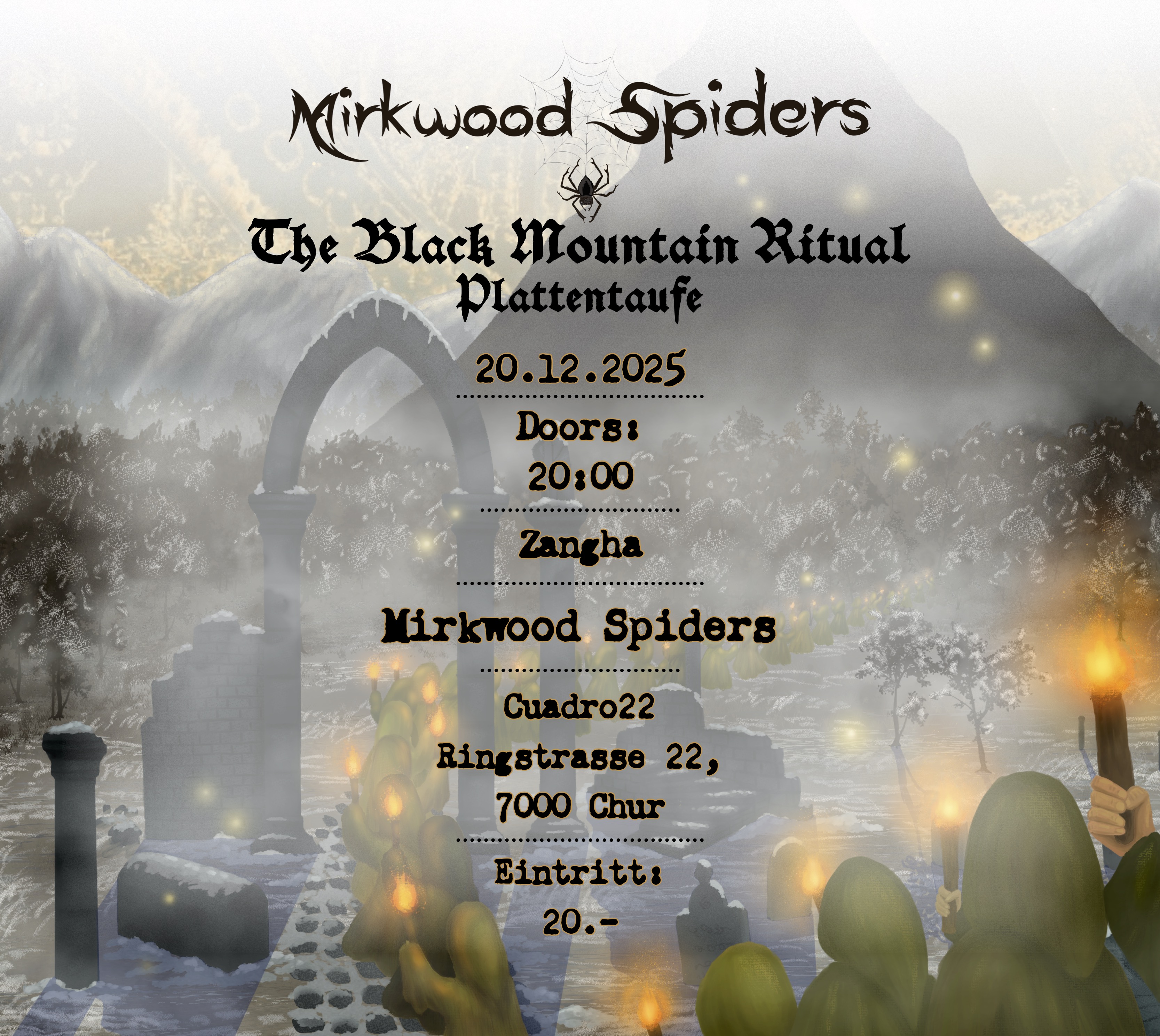 Die Churer Stoner/Progressive Rock Formation Mirkwood Spiders präsentiert ihr brandneues Album The Black Mountain Ritual – Release und Konzert am selben Abend. Seit 2016 schaffen die vier Musiker psychedelische Soundlandschaften, die an Tolkiens dunkle Wälder erinnern: schwere Riffs, hypnotische Grooves, progressive Strukturen. Nach ihrem Album The Realms Of Dreams (2022) führt die neue Platte tiefer in unbekannte Klangrealitäten – ein Trip durch schattige Dimensionen für Fans von Sleep, Kyuss und frühen Mastodon.